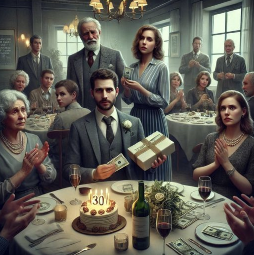 В ресторане были все родственники мужа — его мать, бабушка и разные тёти-дяди. Они пожимали мужу руку, говоря, что его щедрость не знает границ. Муж, оглядывая подарочный конверт с деньгами, недоумённо пожимал плечами — 10 тысяч разве щедрость?